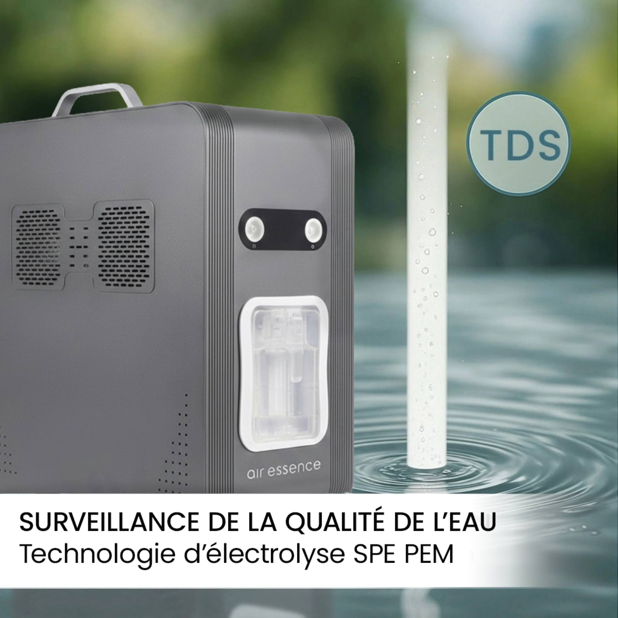 Le système TDS contrôle la qualité de l’eau utilisée pour la production d’hydrogène. Cela garantit à l’utilisateur qu’aucune impureté indésirable ne participe au processus, ce qui assure la pureté du gaz produit et la sécurité de l’inhalation.