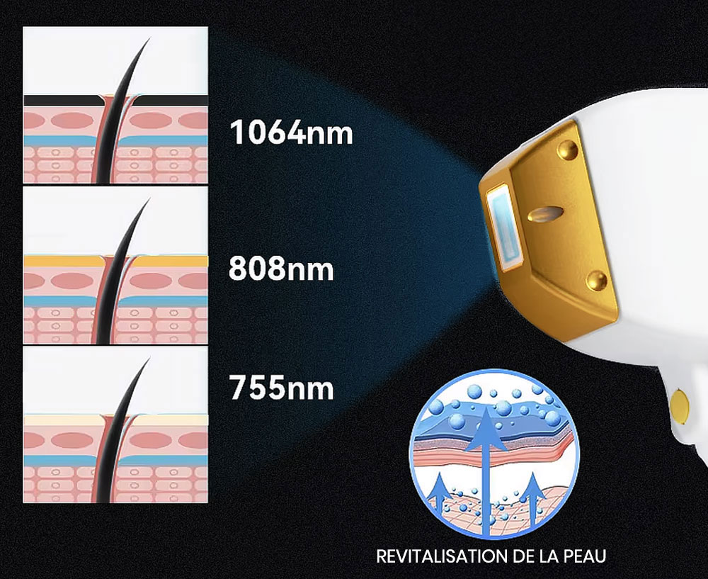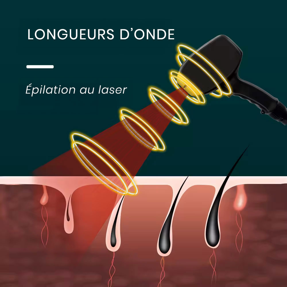 Le laser à diode utilise 3 longueurs d’onde (755 nm, 808 nm, 1064 nm) garantissant une épilation efficace et sûre.