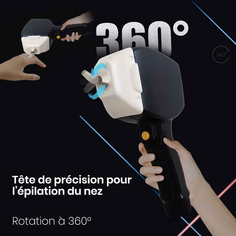 Le laser à diode moderne est équipé d’une tête de précision permettant d’éliminer efficacement les poils indésirables dans les zones difficiles d’accès, telles que le nez. La tête rotative à 360° assure un confort total et une grande précision, permettant de réaliser le traitement rapidement et en toute aisance.