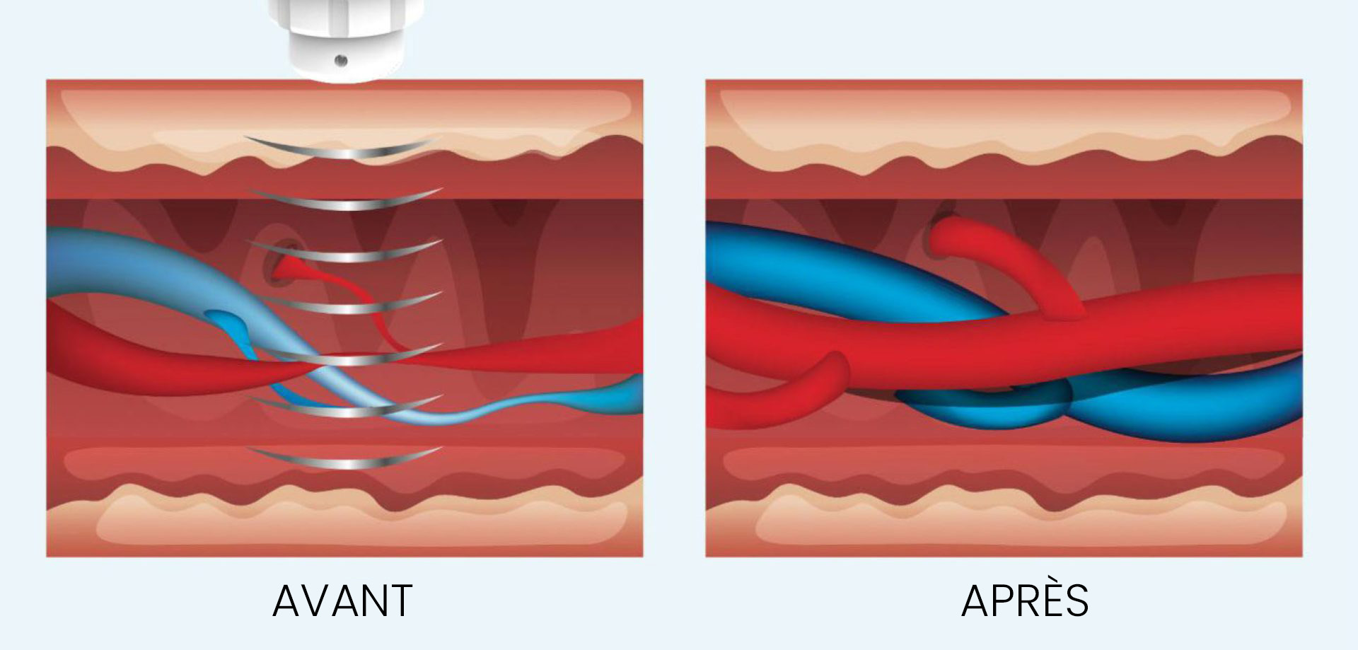 La thérapie par ondes de choc utilise des ondes acoustiques à haute énergie qui pénètrent dans les couches profondes de la peau et du tissu sous-cutané. Cela permet :