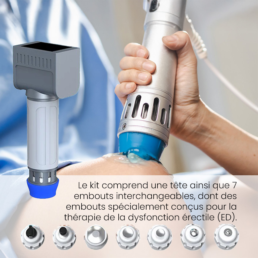 Le kit comprend 7 embouts interchangeables, dont les embouts n°6 et n°7 spécialement conçus pour le traitement de la dysfonction érectile (ED).