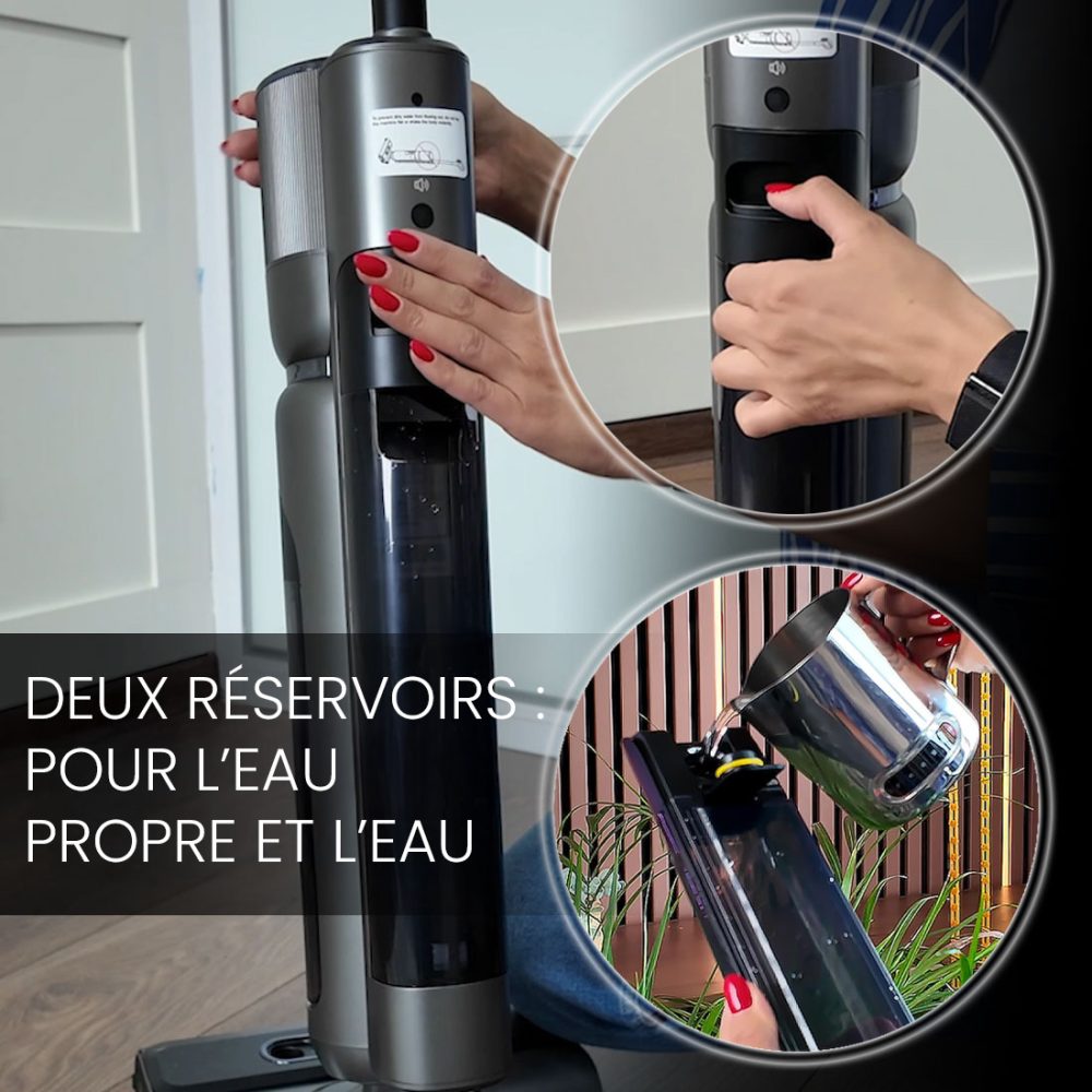 Le réservoir d’eau sale sépare efficacement les déchets secs, tels que les miettes ou les cheveux, de l’eau sale.