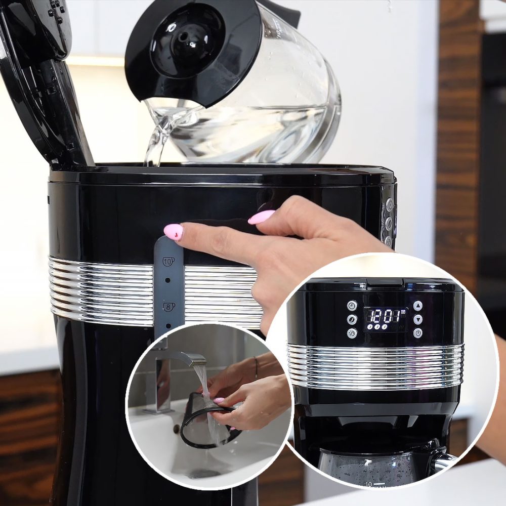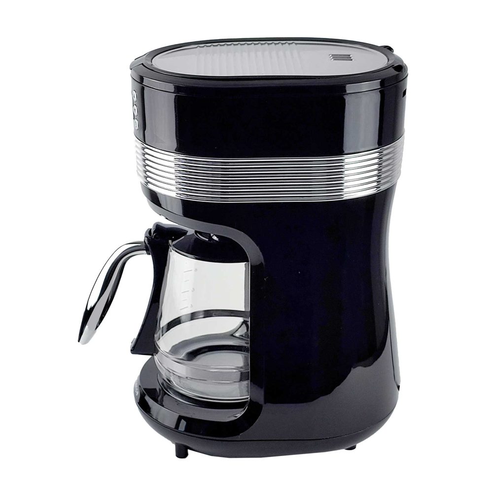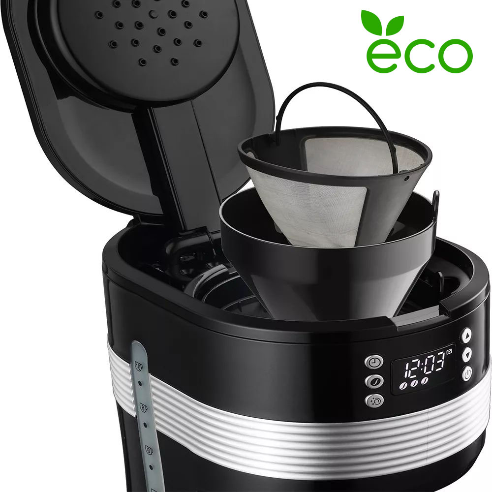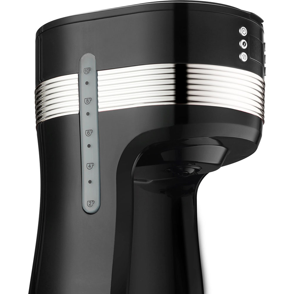 Das Gerät verfügt über ein Fenster zur Anzeige des Wasserstands, einen praktischen herausnehmbaren Filterbehälter sowie einen permanenten Filter, der leicht gereinigt werden kann. Darüber hinaus verfügt die Kaffeemaschine über eine Funktion zur Aufrechterhaltung der Kaffeetemperatur.