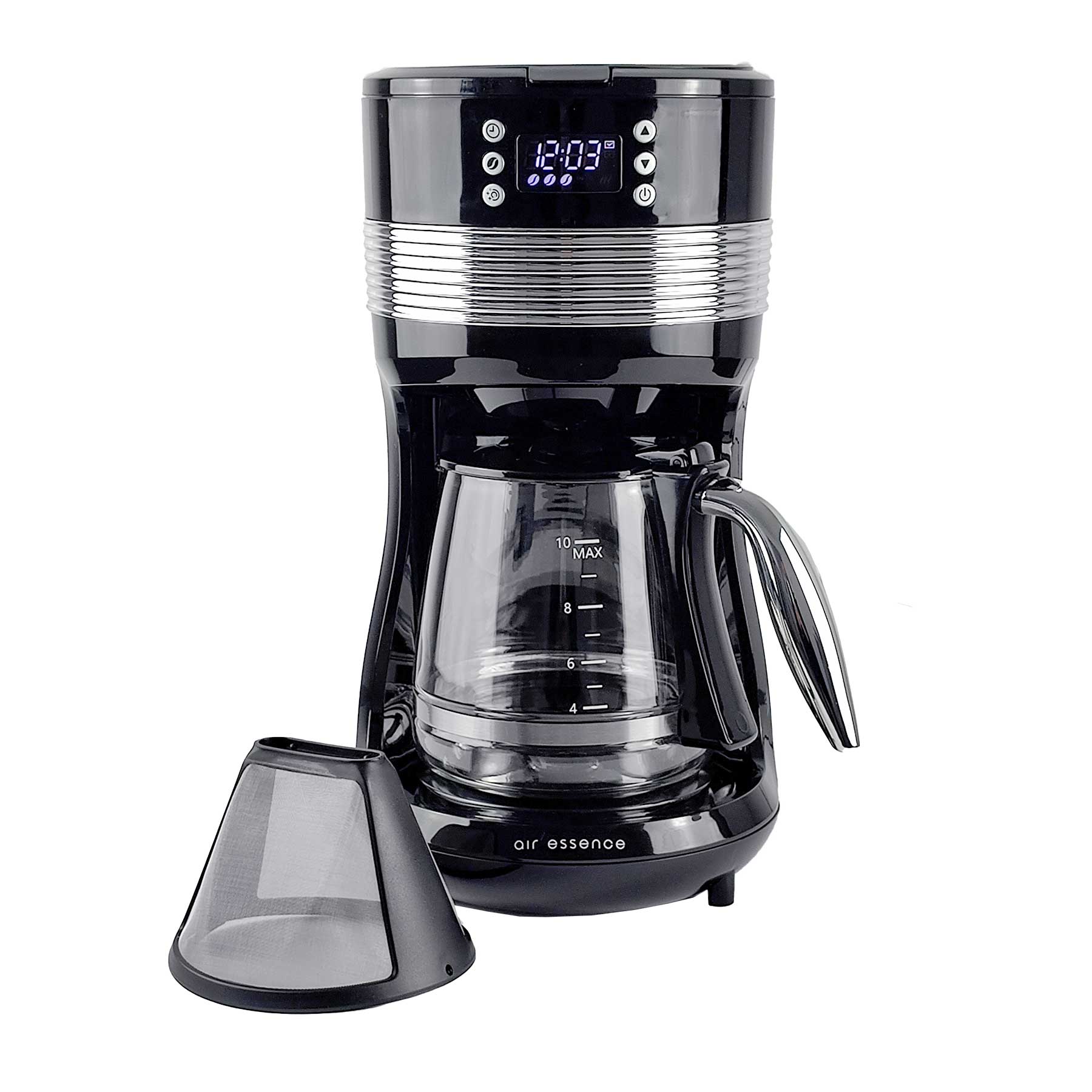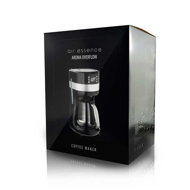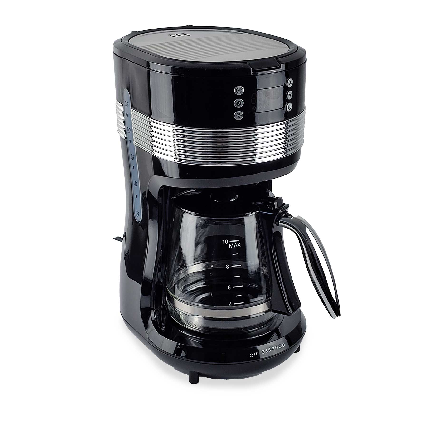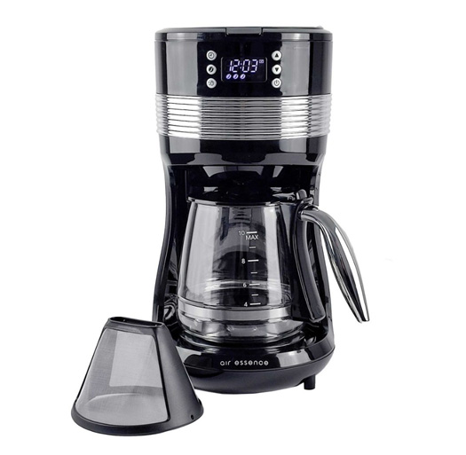Grâce à la programmation de la fonction de temps d’infusion, vous pouvez régler la cafetière pour qu’elle prépare du café pour vous exactement à l’heure souhaitée. Vous vous réveillez et savourez immédiatement votre boisson parfaitement préparée, sans devoir attendre.Die Kaffeemaschine Air Essence zeichnet sich durch ein ästhetisches Design aus, das durch verchromte Details zusätzlich betont wird.