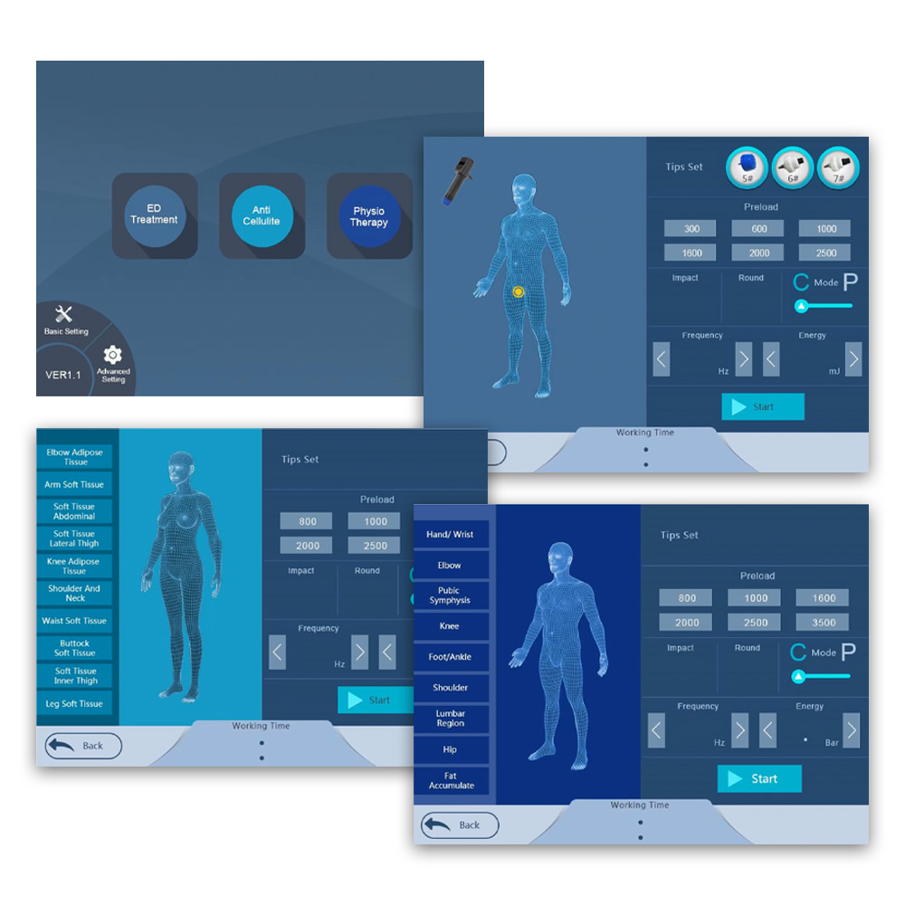 L’écran tactile avancé permet de choisir l’un des trois modes principaux : traitement de la DE, thérapie anticellulite et physiothérapie.