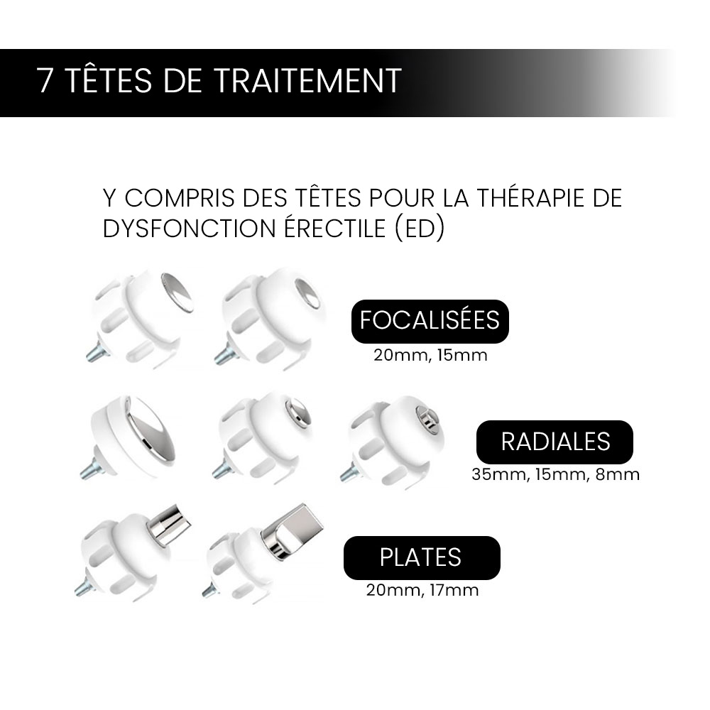 - 2 embouts spécialisés pour le traitement de la DE (dysfonction érectile) – conçus pour un traitement efficace et sûr de cette condition délicate.