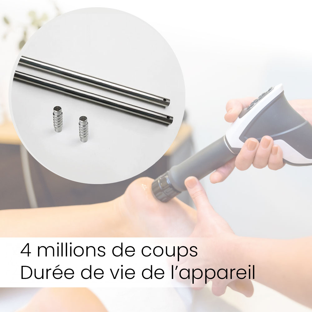 Chaque cartouche est conçue pour résister à jusqu’à 2 millions de coups, garantissant ainsi une durée de vie totale de l’appareil allant jusqu’à 4 millions de coups.