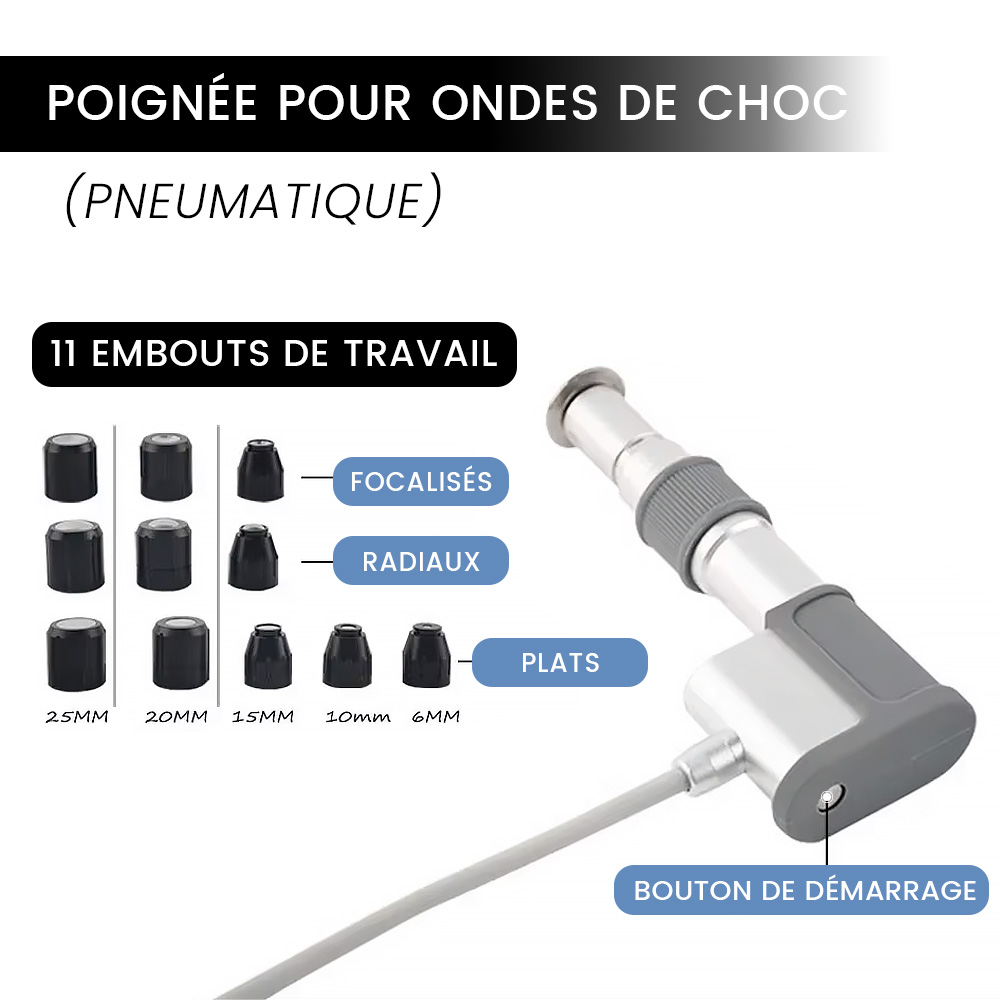 La poignée pneumatique est dotée de 11 embouts variés adaptés à des thérapies ciblées :